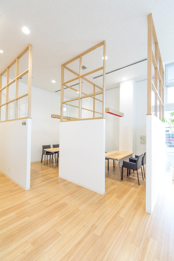 近隣店舗との統合により、展示スペースの面積拡大、全面改装を行った自動車ショールーム。 「女性のお客様、お子様連れのお客様が快適に過ごせるショールーム」という コンセプトを元に計画はスタートしました。 キッズスペースを入店すぐ目に止まるメインの場所に配置し、 商談スペースを隣に配置することで、打合せをしながらもお子様の様子を確認できるようにしています。 また、小さなお子様連れでも使いやすいベンチシートを置き、ファミリーが使いやすいスペースとしました。 一方で、電源設備を完備したカウンター席、一人掛けソファでくつろげるラウンジスペース、 車椅子の方も使えるユニバーサルトイレなども新たに設け、幅広い層のお客様に対しても配慮しています。 明るい木の色、外光をふんだんに取り入れた空間に、コーポレートカラーである赤をアクセントとして使い、 軽やかな印象を持たせることで、より気軽に立ち寄れるショールームを目指しました。